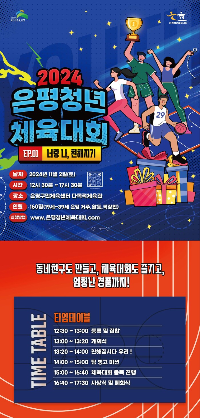 [시민일보 = 이대우 기자] 서울 은평구(구청장 김미경)가 오는 11월2일 은평다목적체육관에서 청년들의 즐거운 일상과 건강한 운동문화 확산을 위한 ‘2024 은평청년 체육대회’를 개최한다.