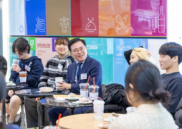 | ▲ 진교훈 서울 강서구청장(왼쪽 세 번째)이 서울호서직업전문학교를 찾아 학생들과 대화를 나누고 있다. (사진=강서구청 제공) |