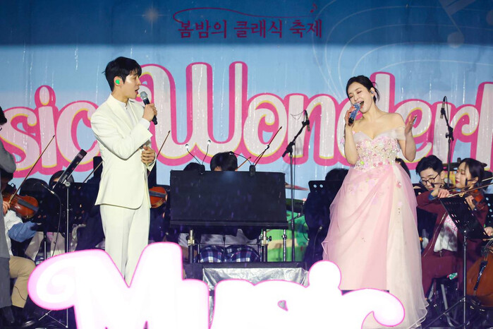 | ▲ 12일 방배뒷벌어린이공원 일대에서 열린 ‘봄밤의 클래식 축제’에서 바이올리니스트 대니구와 뮤지컬배우 정선아가 무대를 선보이고 있다. (사진=서초구청 제공) |