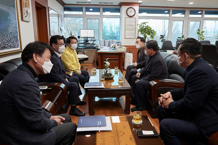충남 아산시는 16일 대한건설협회 충남세종지회와 아산시협의회로부터 희망 나눔캠페인 성금 600만원 전달받고 지역건설산업활성화를 위한 간담회를 했다. 사진은 간담회에서 오세현 시장(가운데 왼쪽)과 관계자들과 대화를 나누고 있는 모습. (사진제공=아산시청)