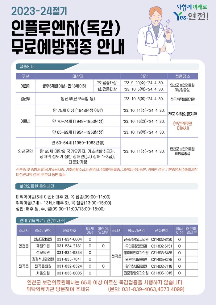 생후 6개월~만 9세 미만 ‘2회 접종’ 대상 어린이는 20일부터, 생후 6개월~만 13세 이하의 ‘1회 접종’ 대상 어린이와 임신부는 오는 10월5일부터 보건의료원 예방접종실(화ㆍ목 오전 9시부터 11시(미취학아동), 오후 1시부터 3시(취학아동)과 주소지 관계없이 전곡온의원, 제일의원 등 가까운 지정 위탁의료기관에서 무료로 접종이 가능하다.