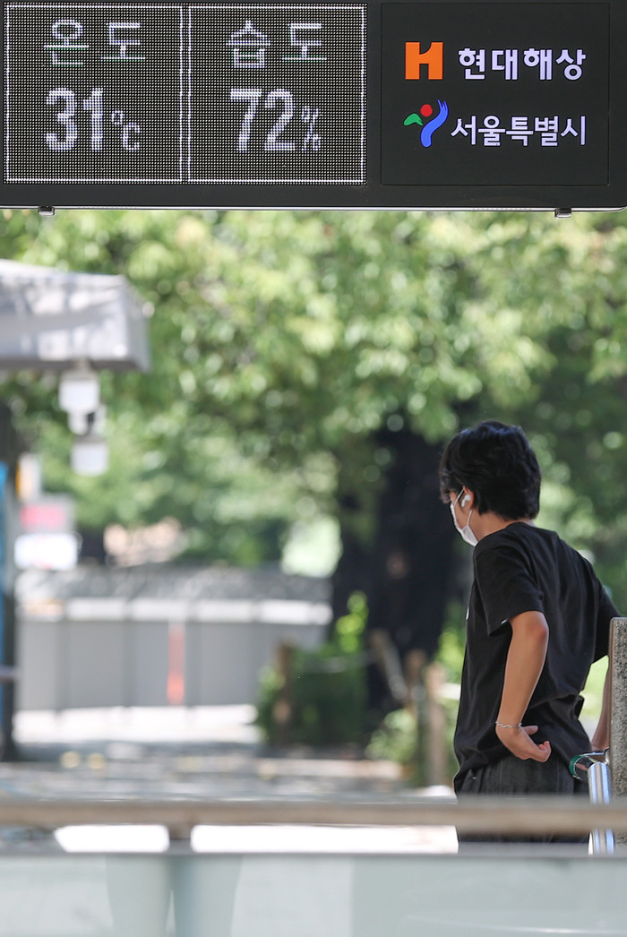 비가 그친 1일 오후 서울 지하철 5호선 여의나루역 전광판에 기온과 습도가 안내되고 있다.