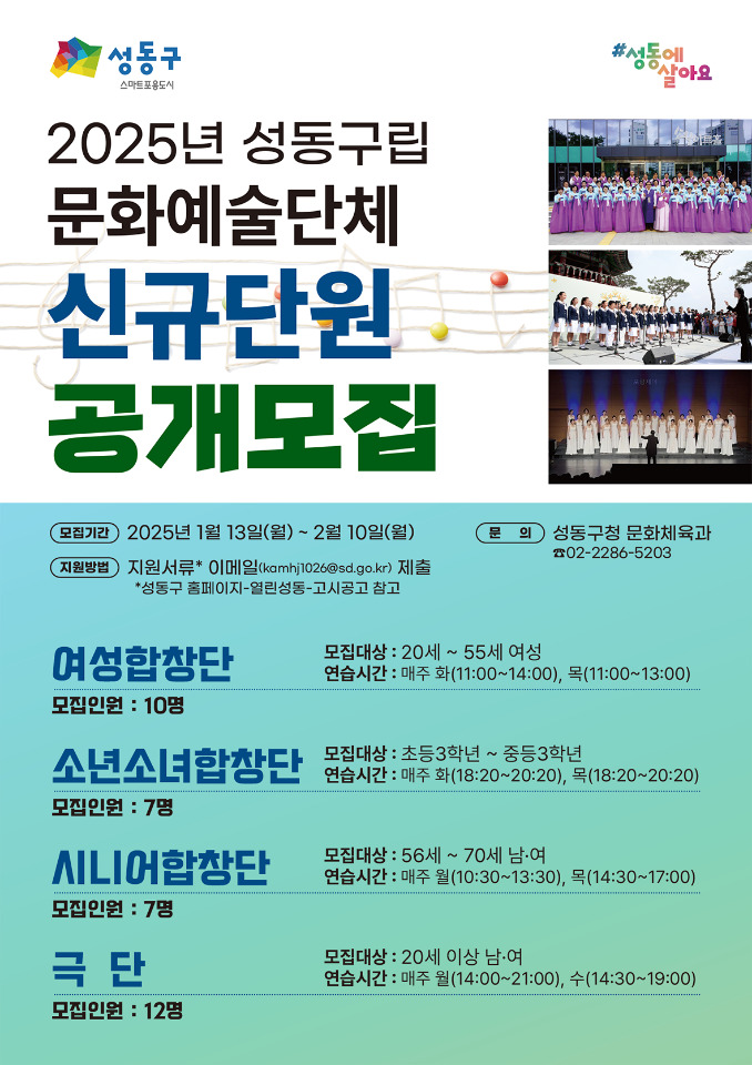 [시민일보 = 박소진 기자] 서울 성동구(구청장 정원오)가 구민들의 문화 향유 기회를 확대하기 위해 성동구립 문화예술단체의 신규단원 36명을 모집한다고 14일 밝혔다.