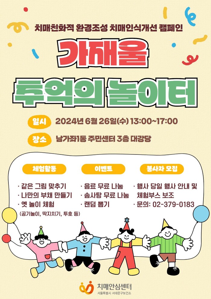 [시민일보 = 변은선 기자] 서울 서대문구치매안심센터가 이달 26일 오후 1∼5시 남가좌1동주민센터 3층 대강당에서 치매 친화적 환경조성을 위한 치매 인식개선 캠페인 ‘가재울 추억의 놀이터’를 진행한다.