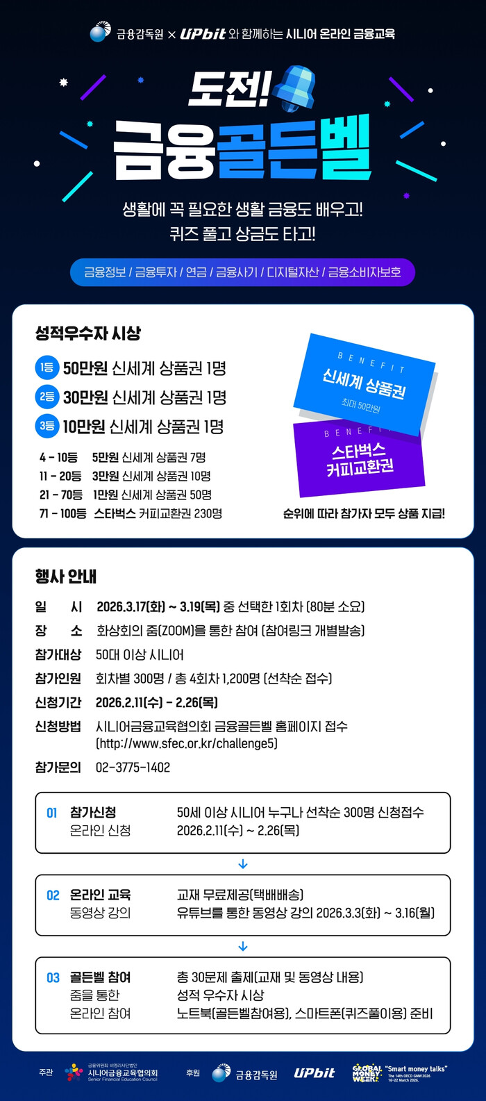 올해 ‘시니어 금융골든벨’ 프로그램은 OECD 산하 국제 금융 교육 네트워크(INFE)가 주관하는 ‘국제 금융 교육 주간(Global Money Week, GMW, 매년 3월 넷째 주 전후)’에 금융감독원과 함께 진행한다.