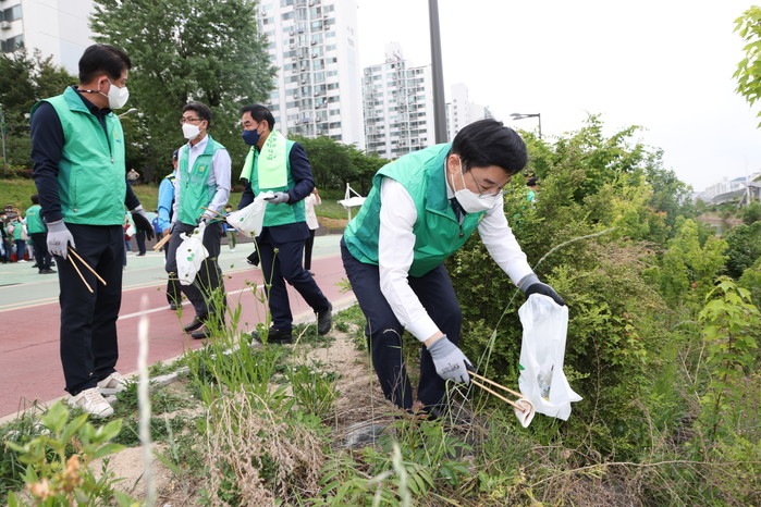 서울 도봉구 새마을운동도봉구지회는 최근 ‘2022년 새마을 줍깅데이’ 행사를 개최해 중랑천변 일대 약 2km 구간에서 줍깅 활동을 펼쳤다. 사진은 행사에 참석한 이동진 구청장(오른쪽)이 중랑천변에 버려진 쓰레기를 줍고 있는 모습. (사진제공=도봉구청)