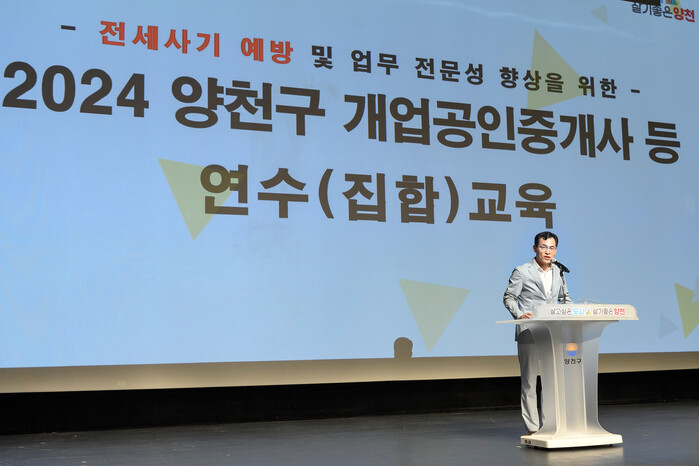 | ▲ 2024년 양천구 개업공인중개사 등 연수교육에서 인사말 중인 이기재 구청장. (사진=양천구청 제공) |