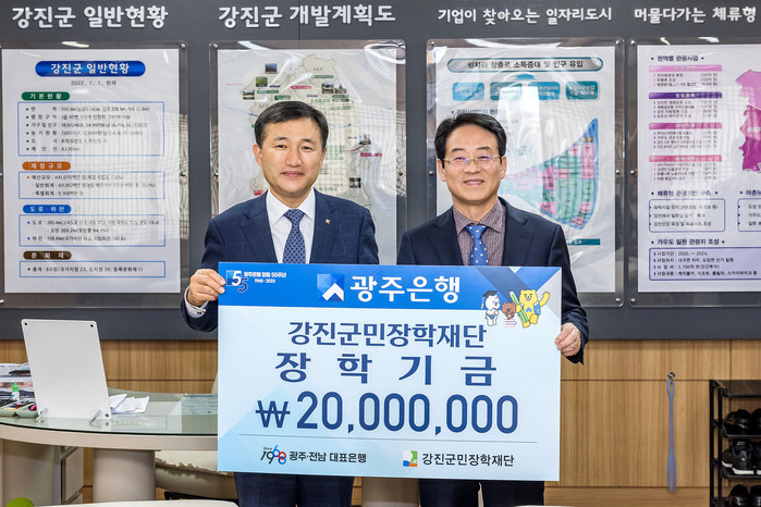 광주은행은 2011년부터 지속적으로 강진군민장학재단에 장학기금을 출연해왔으며, 이번에 전달된 2천만원의 장학기금은 강진군 교육 발전 및 지역인재 양성을 위해 쓰여질 예정이다
