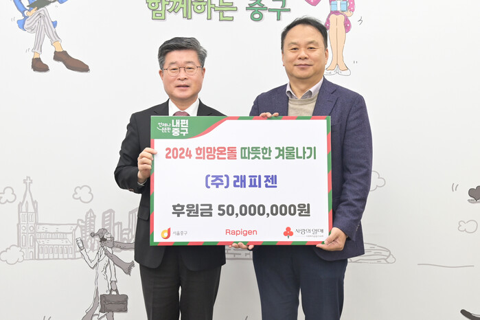 | ▲ 김길성 구청장(왼쪽)이 지역내 저소득 취약계층의 따뜻한 겨울나기를 위해 성금을 전달한 박재구 래피젠 대표와 기념촬영을 하고 있다. (사진=중구청 제공) |