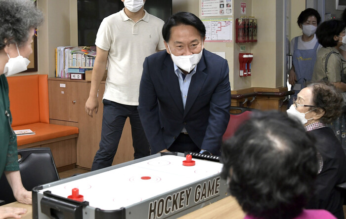 서울 서대문구가 ‘행복 100% 서대문을 위한 구청장 현장 민원실’을 운영한다. 사진은 최근 홍은2동 여민데이케어센터를 방문한 이성헌 구청장(가운데)이 주민들과 인사를 하고 있는 모습. (사진=서대문구청 제공)