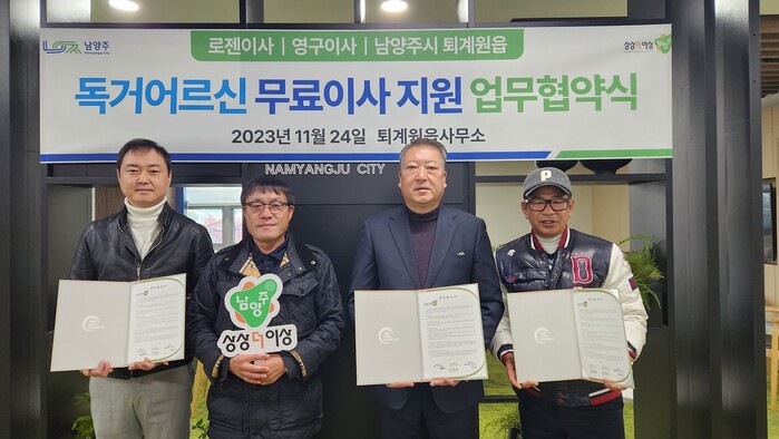 [남양주=손우정 기자] 경기 남양주시 퇴계원읍이 최근 로젠이사(강남점) 및 로뎀나무와 홀몸노인들의 무료이사 지원 서비스를 제공하는 업무협약을 맺었다.