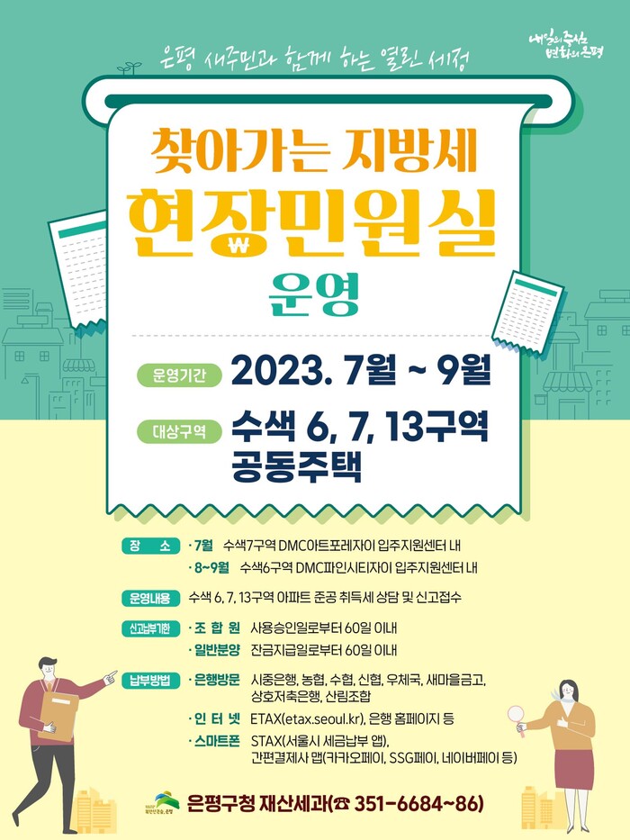 [시민일보 = 이대우 기자] 은평구(구청장 김미경)가 수색 6·7·13구역 아파트 단지 안에 ‘찾아가는 지방세 현장민원실’을 설치, 오는 3일~9월27일 운영한다.