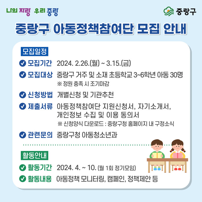 [시민일보 = 여영준 기자] 서울 중랑구(구청장 류경기)는 ‘아동친화도시’를 함께 만들어 갈 ‘중랑구 아동정책참여단’을 모집한다고 6일 밝혔다.