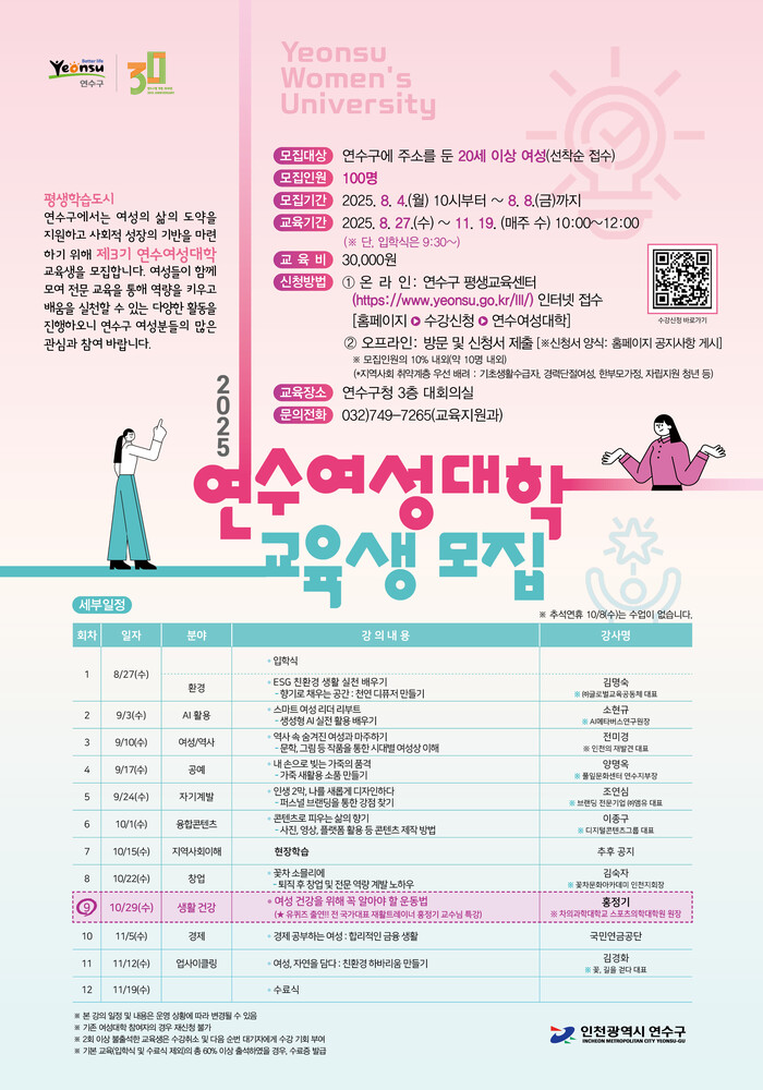 참가 대상은 연수구 거주 20세 이상 성인 여성 100명으로 8월4일부터 8일까지 연수구 평생교육센터 홈페이지에서 선착순으로 신청하면 된다.