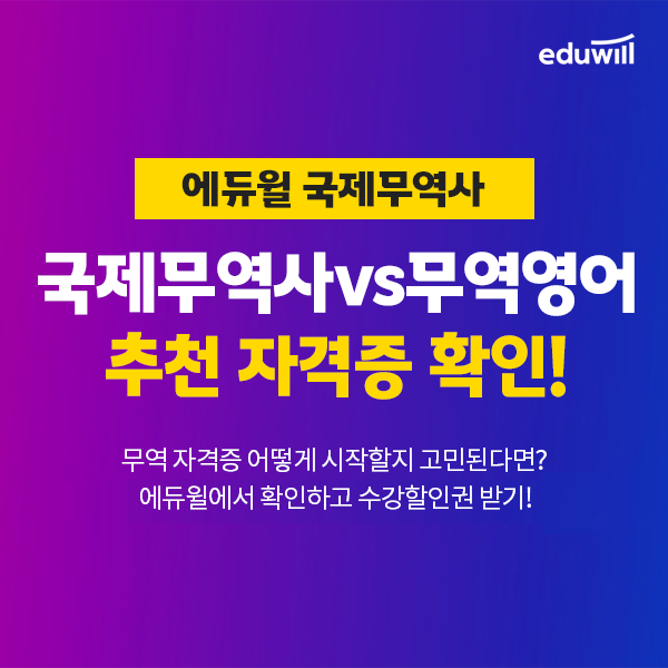 [시민일보 = 여영준 기자] 에듀윌은 국제무역사와 무역영어 자격증 취득을 고민하는 수험생을 위해 '나에게 맞는 자격증은 뭘까' 이벤트를 진행한다고 밝혔다.