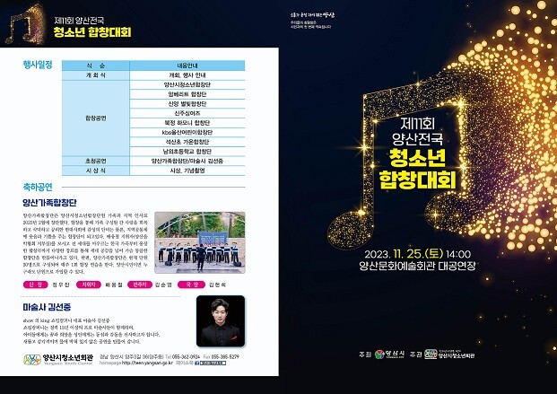 이번 합창대회에는 양산시청소년합창단(양산시청소년회관)의 하모니를 시작으로, 암베리트 합창단(거제 섬김의 교회), 신양 별빛합창단(신양초등학교), 신주싱어즈(신주중학교), 북정 하모니 합창단(북정초등학교), KBS울산어린이합창단(KBS울산), 석산초 가온합창단(석산초등학교), 남외초등학교 합창단(울산남외초등학교) 등 양산, 울산, 거제에서 총 8팀의 초·중등학생 합창팀이 참가하여 각 팀의 기량을 맘껏 펼칠 예정이다. 양산가족합창단과 김선중 마술사의 축하공연도 준비되어 있어 다채로운 공연을 즐길 수 있다.