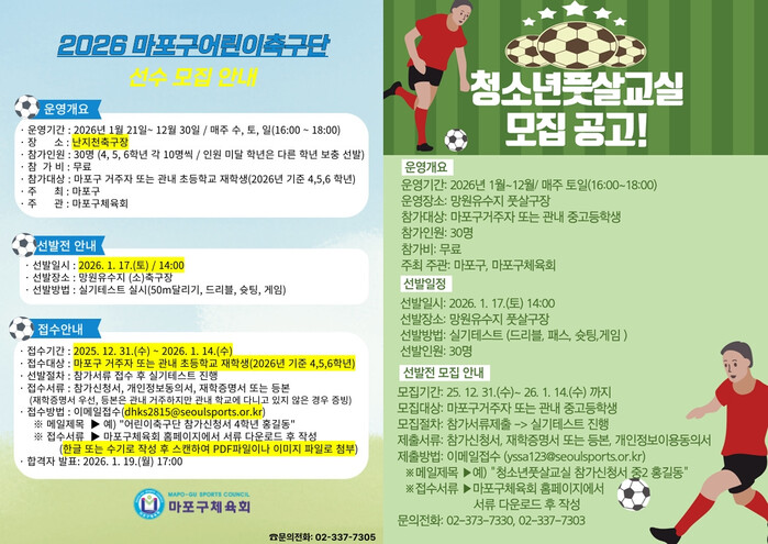 [시민일보 = 문민호 기자] 서울 마포구(구청장 박강수)는 지역 체육 인재를 육성하기 위해 ‘2026 마포구어린이축구단’과 ‘2026 마포구청소년풋살교실’ 참가자를 모집한다고 8일 밝혔다.