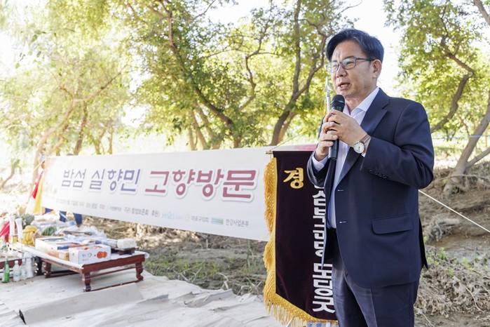 박강수 구청장은 최근 밤섬 옛 주민들의 향수를 달래기 위한 ‘밤섬 실향민 고향방문 행사’에 참석했다. 행사는 박 구청장을 비롯해 70여명이 참석한 가운데 밤섬에 올라 귀향제를 지내는 방식으로 진행됐다. 사진은 박 구청장이 인사말을 전하고 있는 모습. (사진제공=마포구청)