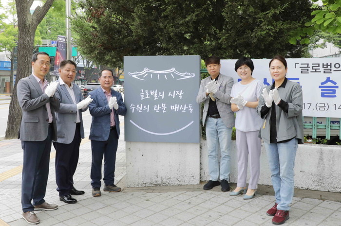 경기 수원시 팔달구 매산동행정복지센터는 최근 수원세무서 옆 담장에서 매산동 슬로건 동판 제막식을 개최했다. 제막식에는 김현광 팔달구청장, 김경목 김영진국회의원 보좌관, 이혜련 수원시의원, 김호겸 경기도의원 당선인, 국미순 수원시의원 당선인, 김웅진 주민자치위원장, 진복례 통장협의회장 등 50여명이 참석했다. 사진은 제막식에 참석한 관계자들이 기념촬영을 하는 모습. (사진제공=팔달구청)