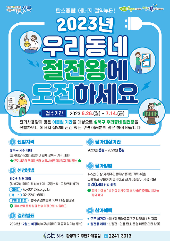 [시민일보 = 홍덕표 기자] 성북구(구청장 이승로)는 여름철 에너지 절약에 앞장서는 '2023년도 우리동네 절전왕'을 선발한다고 28일 밝혔다.