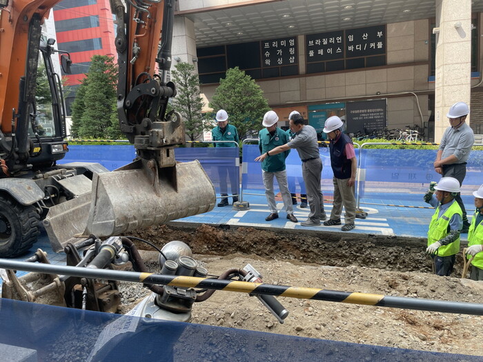 | ▲ 엄의식 부구청장이 관계자들과 하수관로 개량공사 현장을 방문해 현장점검을 하고 있다. (사진=구로구청 제공) |