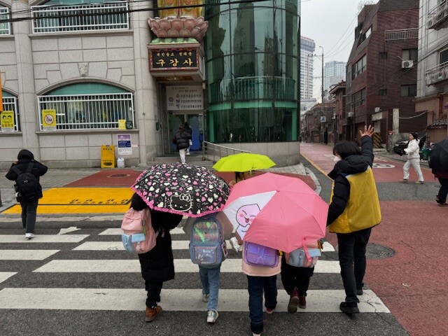 | ▲ 강동구 어린이 교통안전지도사가 어린이들의 하굣길에 동행하고 있다 (사진=강동구청 제공) |