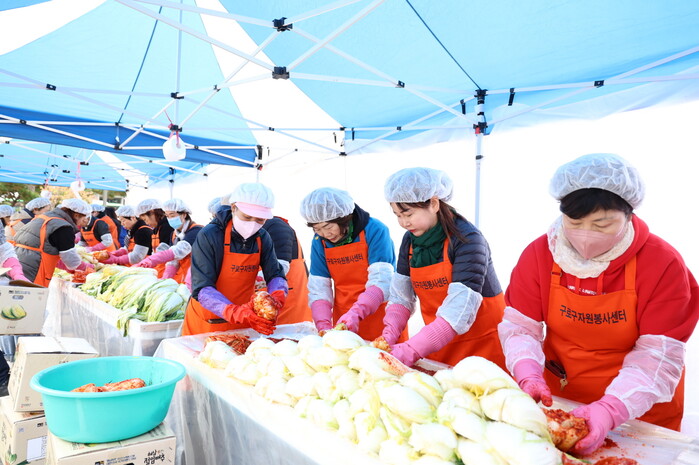 | ▲ 구로구 자원봉사협력단 봉사자들이 김치를 담그고 있다. (사진=구로구청 제공) |