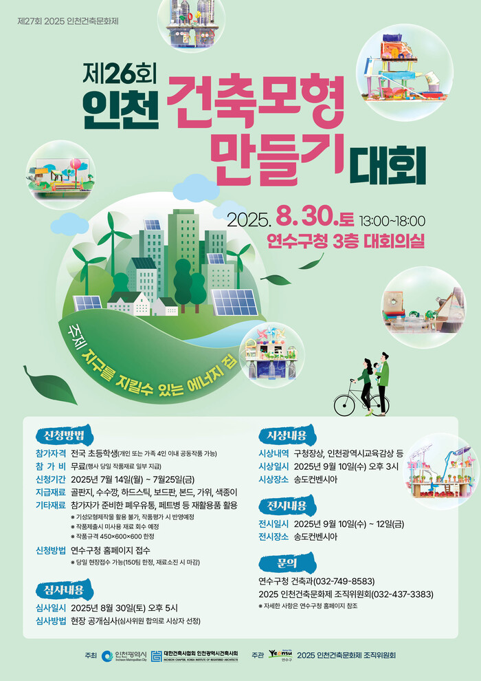 [인천=문찬식 기자] 인천 연수구가 오는 8월30일 오후 1시부터 구청 대회의실에서 열리는 초등학생 대상 창의적 건축 체험 행사인 ‘2025년도 연수구 건축 모형 만들기 대회’의 참가자 150팀을 모집한다.