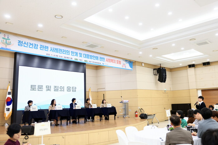 [시민일보 = 이대우 기자] 서울 구로구(구청장 문헌일)가 최근 ‘2023년 사회복지 포럼’(이하 공개 토론회)을 열고 사회복지 현장에서 정신건강의 어려움을 겪고 있는 대상자에 대한 개입 및 사례관리에서 겪는 고충, 한계 등에 대한 대응방안에 대해 토론을 진행했다.
