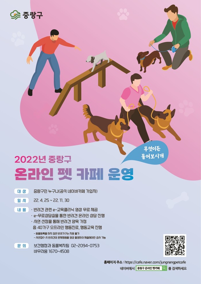 [시민일보 = 여영준 기자] 중랑구는 올바른 반려동물 문화 정착을 위해 반려인을 대상으로 오는 11월까지 ‘중랑구 온라인 펫 카페 무엇이든 물어보시개’ 프로그램을 운영한다고 26일 밝혔다.