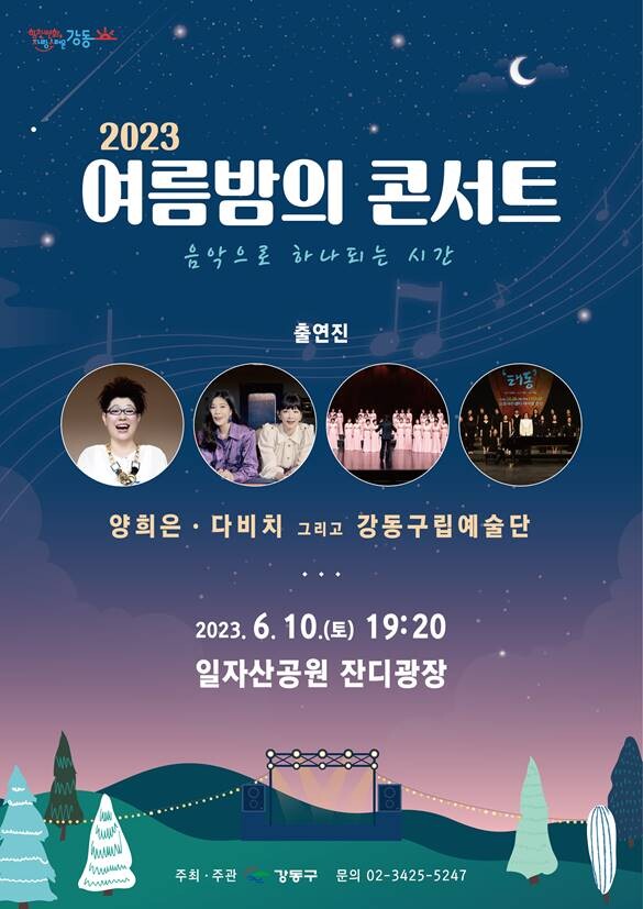 걷기대회가 끝나면 오후 7시 20분부터 80여 분간 여름밤 콘서트가 펼쳐질 예정이다. 강동구립예술단 소속인 여성합창단과 시니어합창단의 합동공연을 시작으로, 7080 대표 가수 양희은, 여성듀오 보컬그룹 다비치가 대중적으로 잘 알려진 명곡들을 선보인다. 전 연령대가 즐길 수 있는 다양한 장르의 볼거리를 제공할 것으로 기대된다.
