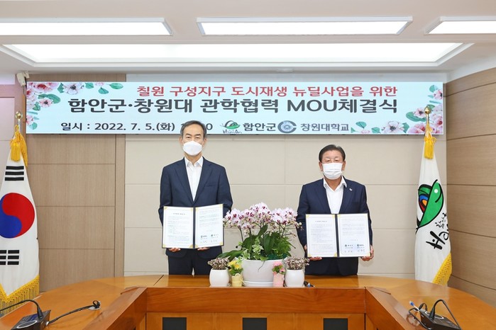 [함안=최성일 기자] 함안군은 지난 5일 오전 11시 함안군청 2층 소회의실에서 창원대와 칠원 구성지구 도시재생뉴딜사업 관학 협력 MOU를 체결했다.
