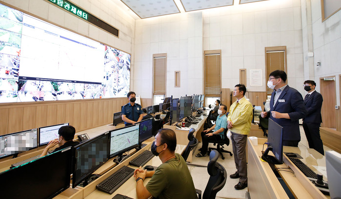김태우 서울 강서구청장은 27일 ‘Smart City 강서통합관제센터’를 찾아 방범용CCTV 운영현황, 지능형(AI) 선별관제시스템 등 통합관제시스템을 점검했다. 사진은 김 구청장(오른쪽 세 번째)이 관계자들과 함께 통합관제시스템을 살펴보고 있는 모습. (사진제공=강서구청)