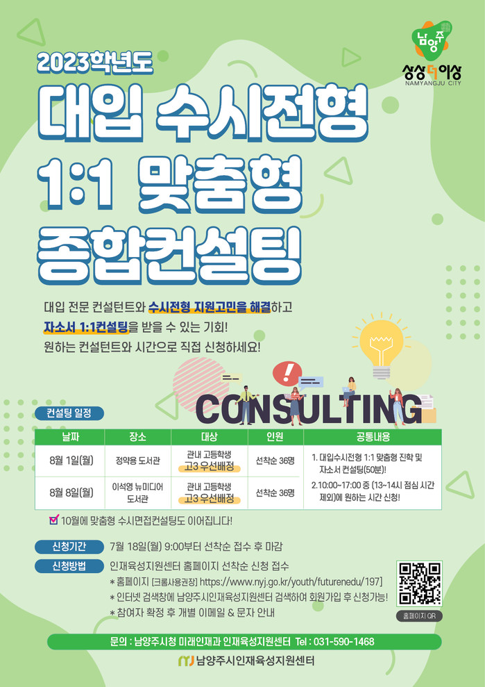 컨설팅은 8월1일 정약용도서관, 8월8일 이석영뉴미디어도서관에서 오프라인으로 진행되며, 지역내외 대입전문가를 초빙해 수험생의 수시전형 지원전략 및 자기소개서 컨설팅을 무료로 제공한다.