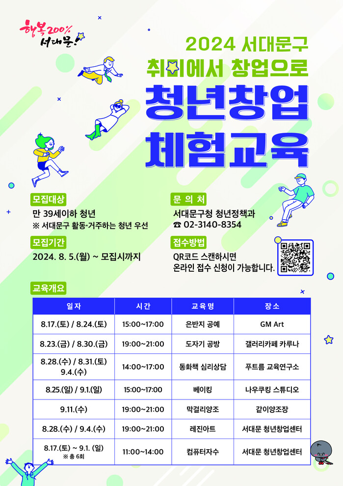 [시민일보 = 이대우 기자] 서울 서대문구(구청장 이성헌)가 청년들이 취미를 발전시켜 창업할 수 있도록 ‘2024 서대문구 청년창업 체험교육’ 참가자 모집에 들어갔다.