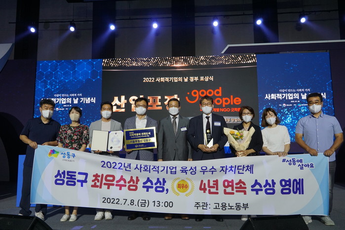 [시민일보 = 홍덕표 기자] 성동구(구청장 정원오)는 고용노동부 주관 '2022년 사회적기업 육성 우수자치단체 평가'에서 최우수상을 수상했다고 11일 밝혔다.