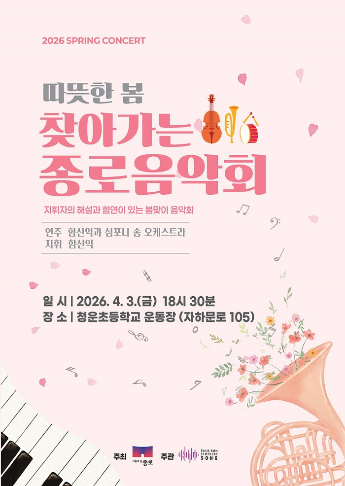 또 4월3일 오후 6시30분에는 청운초등학교 운동장에서 ‘봄’과 ‘꽃’을 주제로 한 야외 클래식 공연 ‘따뜻한 봄 찾아가는 종로음악회’를 연다.