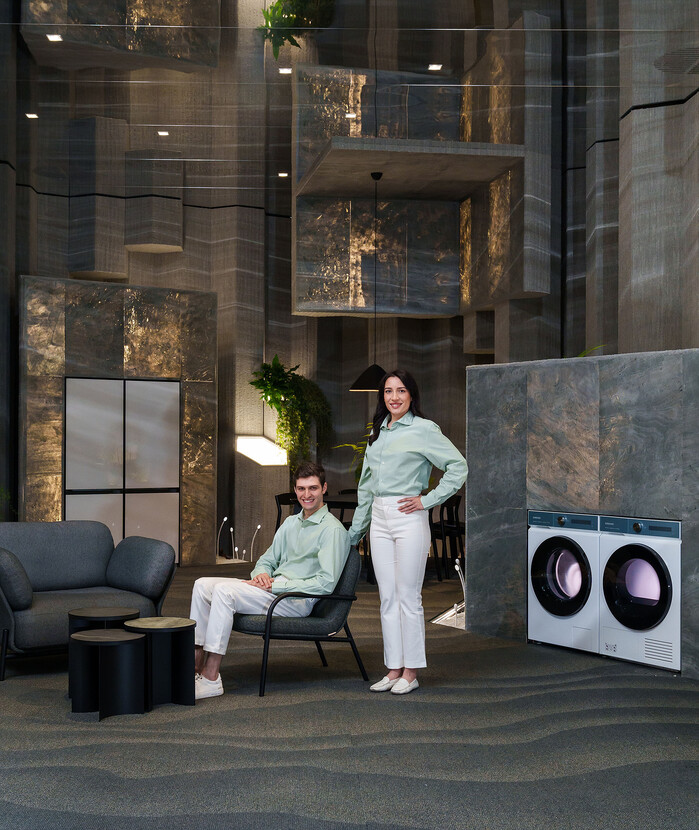 가전을 사용하면서도 지속가능한 일상을 할 수 있도록 돕고자 하는 삼성전자의 가치를 폐어망ㆍ재활용 소재로 만들어진 카펫(펠릿) 등을 활용해 시각화한 공간을 구성했다.