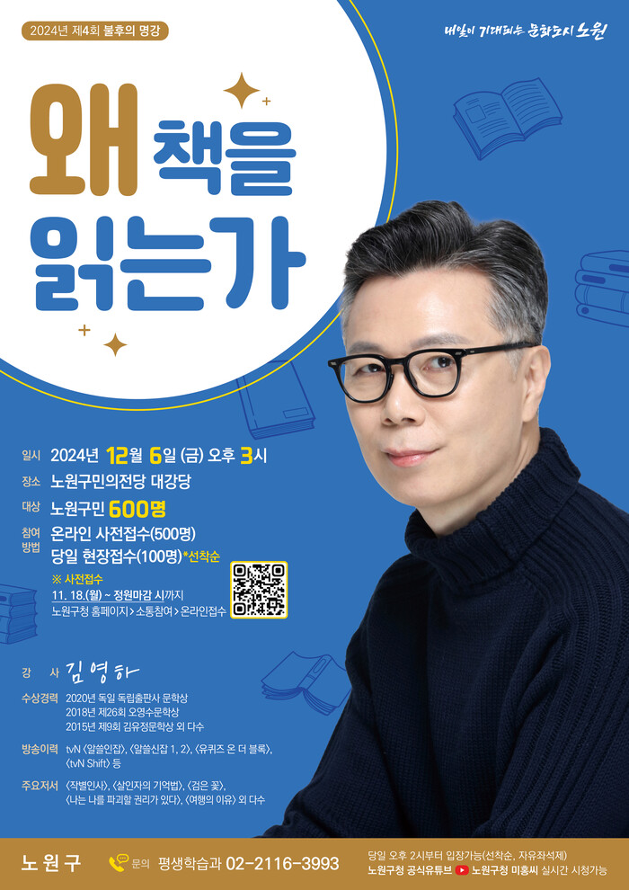 이번 강의는 오후 3시 노원구민의전당 대강당에서 개최되는 ‘왜 책을 읽는가’를 주제로 김영하 작가가 강연자로 나선다.