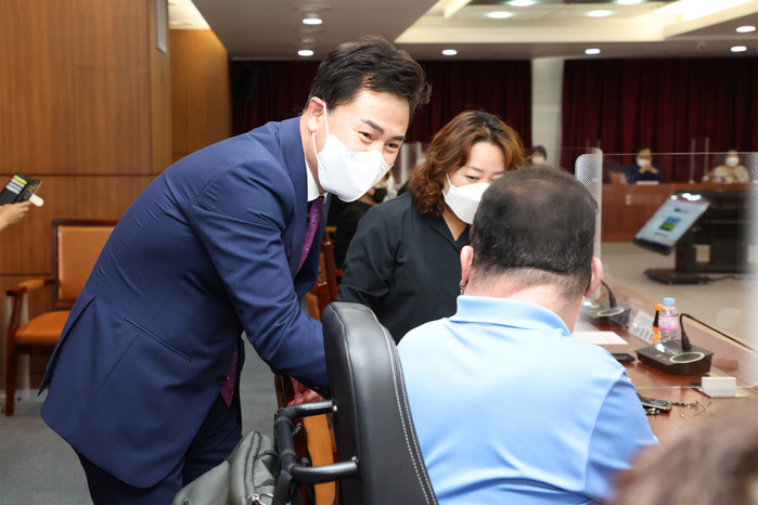 | ▲ 최근 돌봄SOS센터 업무협약식에 참석한 오언석 구청장(왼쪽)이 관계자들과 이야기를 나누고 있는 모습. (사진제공=도봉구청) |