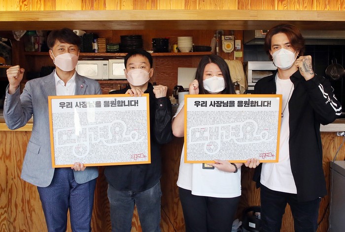 ‘착한 액자’ 전달식은 땡겨요를 사용 중인 이벤트 당첨자, ‘착한 리뷰송’ 모델인 가수 이혁, 신한은행 전성호 본부장이 땡겨요 우수 리뷰 가맹점을 방문해 진행됐다.