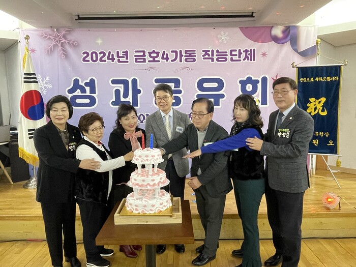 | ▲ 지난 20일, 금호4가동 직능단체 연합 성과공유회에서 케이크 커팅식을 하는 모습. (가운데 정원오 성동구청장) (사진=성동구청 제공) |