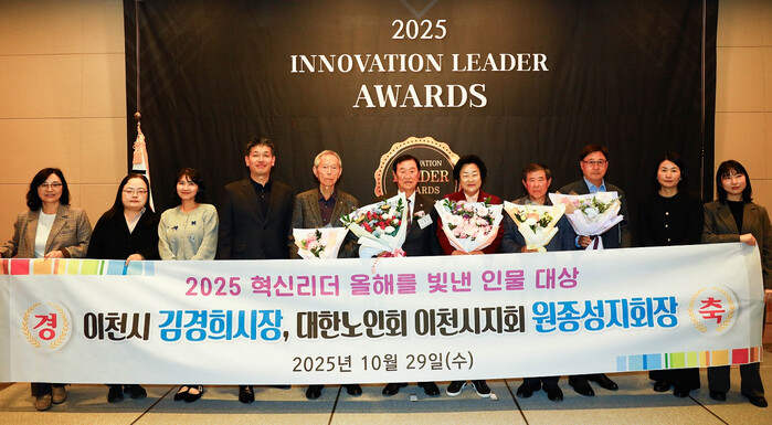 경기 이천시가 최근 ‘2025 혁신 리더 올해를 빛낸 인물 대상’ 시상식에서 김경희 시장이 ‘행정발전공헌 부문 대상’을, 원종성 대한노인회 이천시지회 지회장이 ‘우수 시니어 지도자 노인복지 및 지역사회공헌 부문 대상’을 수상했다고 밝혔다. 사진은 시상식에서 김 시장(오른쪽 다섯 번째)이 관계자들과 기념 촬영을 하는 모습. (사진=이천시청 제공)