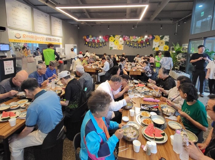 경기 광주시 오포1동 지역사회보장협의체는 최근 취약계층 노인들을 대상으로 ‘으라차차! 힘이난닭!’ 삼계탕 식사 지원 및 이웃돕기 후원물품 전달식을 개최했다. 사진은 대상 노인들에게 삼계탕을 대접하고 있는 모습. (사진=광주시청 제공)