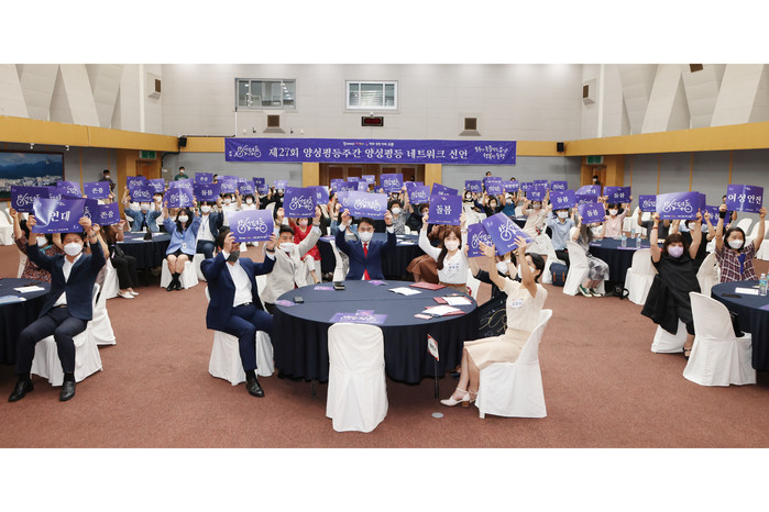 서울 도봉구는 ‘돌봄’을 주제로 최근 ‘제27회 양성평등주간 기념식’을 개최했다. 이날 참가자들은 ‘양성평등을 위한 우리의 약속’을 낭독했다. 사진은 오언석 구청장(가운데)이 기념촬영을 하고 있는 모습. (사진제공=도봉구청)