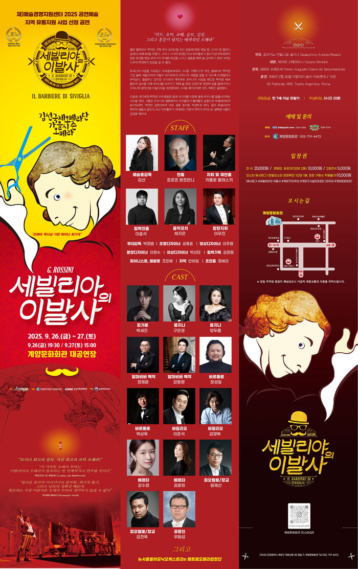 [인천=문찬식 기자] 인천광역시계양구시설관리공단(이사장 박성민)이 오는 9월 26일과 27일, 계양문화회관 대공연장에서 대한민국 오페라 대상 수여에 빛나는 명작 ‘만능재치꾼 피가로_세빌리야의 이발사’를 무대에 올린다.