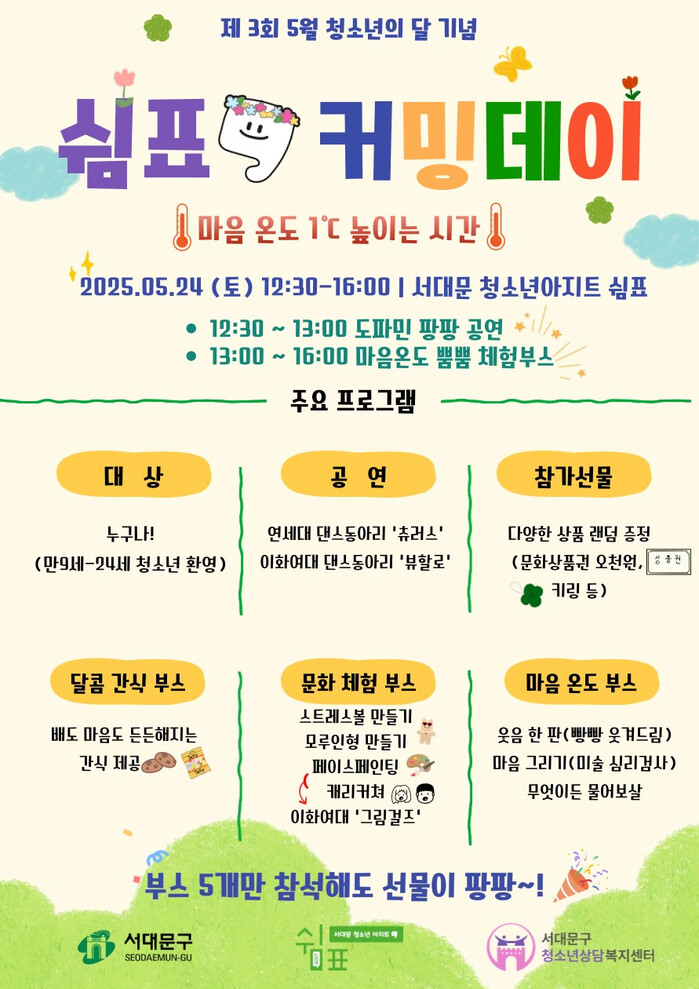 [시민일보 = 이대우 기자] 서울 서대문구(구청장 이성헌)가 5월 청소년의 달을 맞아 오는 24일 낮 12시30분~오후 4시 서대문 청소년 아지트 ‘쉼표’(성산로 444-2)에서 ‘2025 쉼표 커밍데이’ 행사를 개최한다.