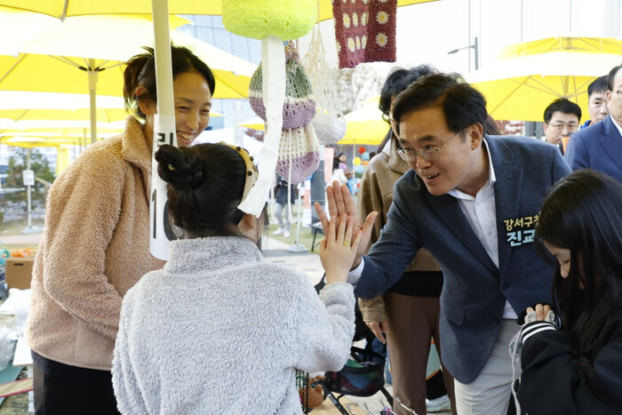 진교훈 서울 강서구청장이 최근 발산근린공원에서 열린 ‘발산마을축제’에 참석했다. 사진은 진 구청장(오른쪽)이 플리마켓에 참여한 아이와 손을 맞대고 인사하는 모습. (사진=강서구청 제공)