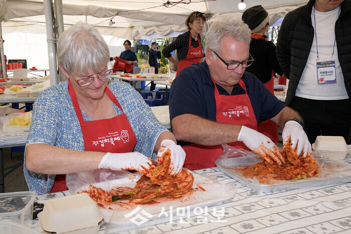 | ▲ 김치담그기 체험을 하고 있는 외국인들 / 광주광역시 제공 |