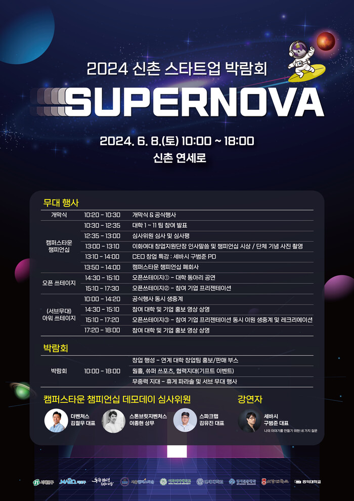 올해로 3회를 맞이하는 ‘2024 신촌 스타트업 박람회’는 창업기업과 시민들을 연결하는 장으로 선도적 플랫폼형 박람회다. 이번 박람회는 ‘진정한 S(Self)=나’를 찾는 여정을 콘셉트로 하며, 창업기업과 지역사회가 어우러져 상생하는 대규모 거리축제를 선사할 예정이다.